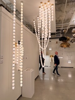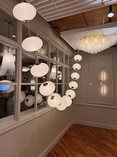 Brass is still strong, but I saw plenty of polished nickel, matte black, and even painted finishes, often layered in the same fixture. Lighting is more sculptural and expressive than ever.
