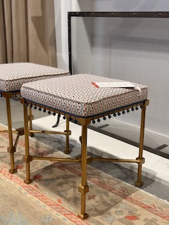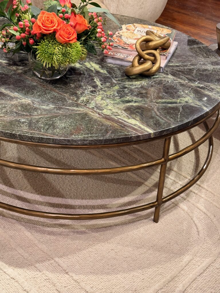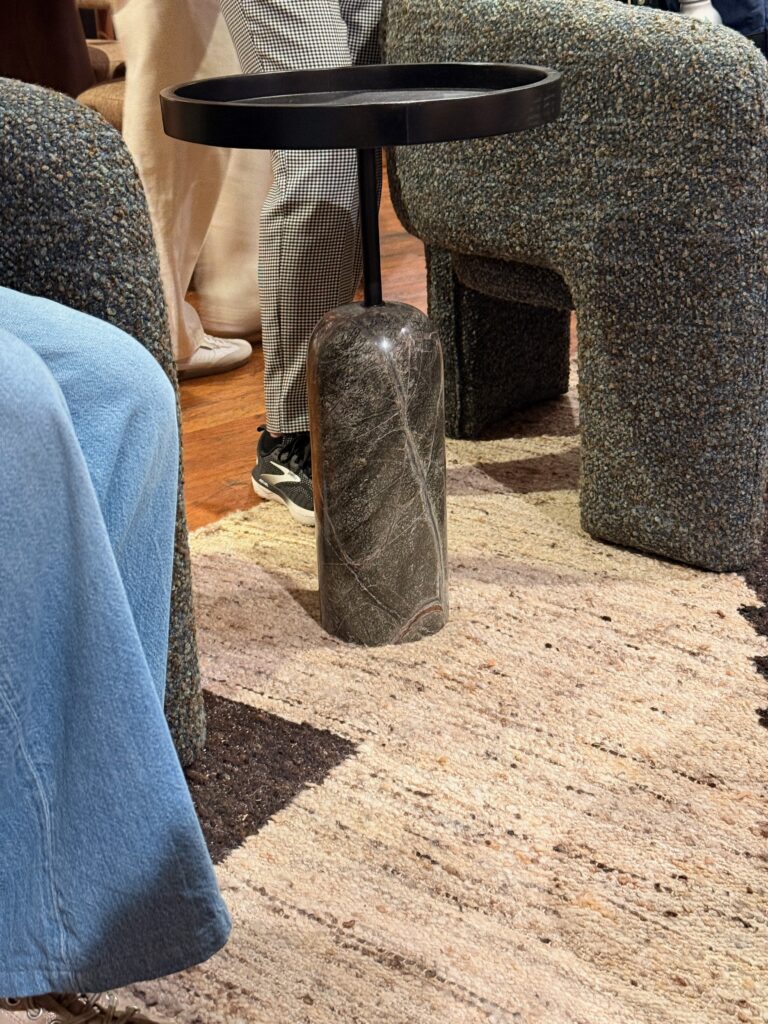 This is the year of contrast. I saw wood paired with leather, upholstery with metal, and stone alongside brass. These layered combinations are showing up in casegoods, lighting, and even upholstery frames.